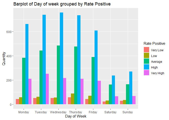 Plot 5: Barplot of Number of articles grouped by Rate Positive and the Day of the week.