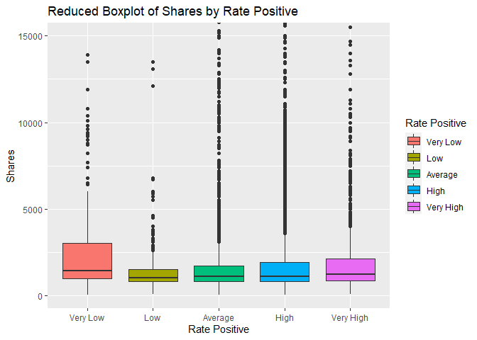 coord_cartesian(ylim = c(0,15000))+labs(x="Rate Positive", y = "Shares", title="Reduced Boxplot of Shares by Rate Positive")+scale_fill_discrete(name="Rate Positive")