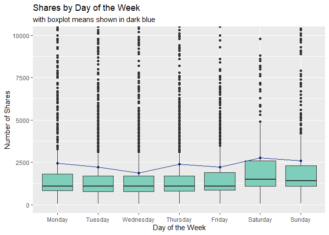 labs(title = "Shares by Day of the Week", subtitle = "with boxplot means shown in dark blue", x = "Day of the Week", y = "Number of Shares")