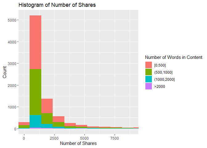 This histogram shows how the number of shares are distributed based on the number of words in the article. If the data is right skewed, then most articles had a lower number of shares, and the inverse is also true. In addition, the amount of a certain color on the histogram shows how the number of shares is associated with article length. For example, if there is a lot of red near the lower values of the x-axis, then that means there were a lot of articles with a low number of shares and fewer than 500 words.