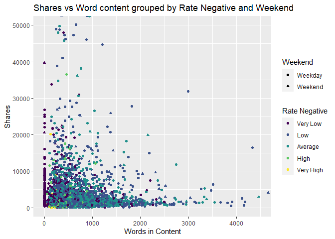 ggplot(newspop,aes(x=n_tokens_content,y=shares))+geom_point(aes(color=RateNeg,shape=weekend))+coord_cartesian(xlim=c(0,4500),ylim = c(0,50000))+labs(x="Words in Content", y="Shares",title="Shares vs Word content grouped by Rate Negative and Weekend", color="Rate Negative",shape="Weekend")