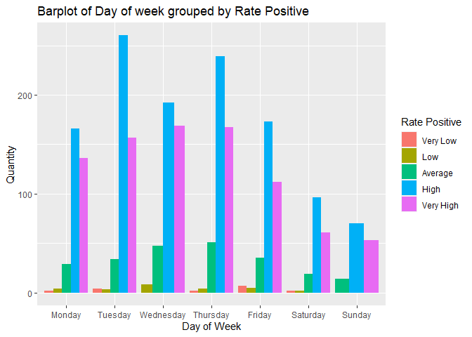 Plot 5: Barplot of Number of articles grouped by Rate Positive and the Day of the week.