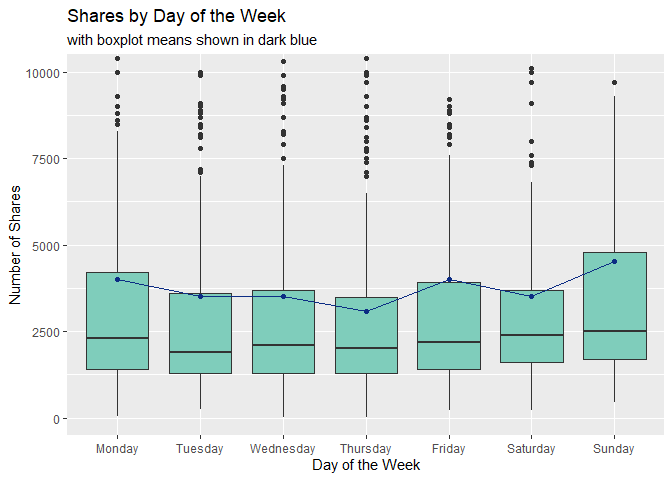 labs(title = "Shares by Day of the Week", subtitle = "with boxplot means shown in dark blue", x = "Day of the Week", y = "Number of Shares")