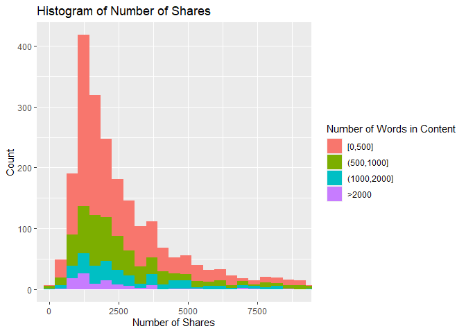 This histogram shows how the number of shares are distributed based on the number of words in the article. If the data is right skewed, then most articles had a lower number of shares, and the inverse is also true. In addition, the amount of a certain color on the histogram shows how the number of shares is associated with article length. For example, if there is a lot of red near the lower values of the x-axis, then that means there were a lot of articles with a low number of shares and fewer than 500 words.