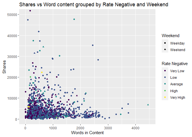 ggplot(newspop,aes(x=n_tokens_content,y=shares))+geom_point(aes(color=RateNeg,shape=weekend))+coord_cartesian(xlim=c(0,4500),ylim = c(0,50000))+labs(x="Words in Content", y="Shares",title="Shares vs Word content grouped by Rate Negative and Weekend", color="Rate Negative",shape="Weekend")