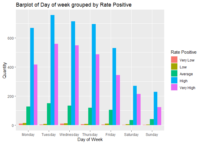 Plot 5: Barplot of Number of articles grouped by Rate Positive and the Day of the week.