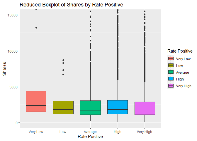 coord_cartesian(ylim = c(0,15000))+labs(x="Rate Positive", y = "Shares", title="Reduced Boxplot of Shares by Rate Positive")+scale_fill_discrete(name="Rate Positive")