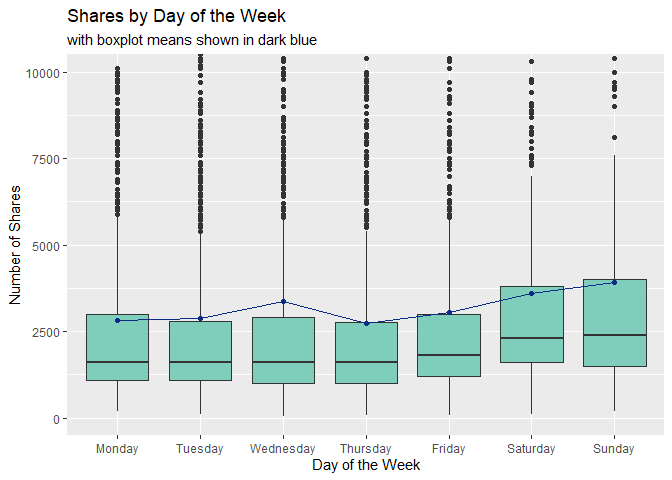 labs(title = "Shares by Day of the Week", subtitle = "with boxplot means shown in dark blue", x = "Day of the Week", y = "Number of Shares")