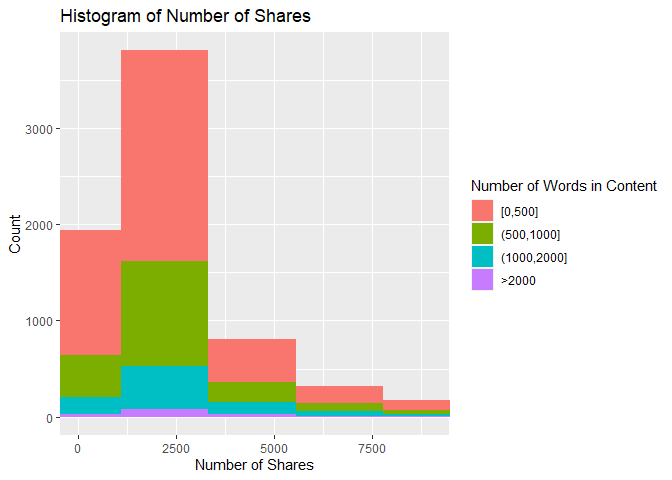 This histogram shows how the number of shares are distributed based on the number of words in the article. If the data is right skewed, then most articles had a lower number of shares, and the inverse is also true. In addition, the amount of a certain color on the histogram shows how the number of shares is associated with article length. For example, if there is a lot of red near the lower values of the x-axis, then that means there were a lot of articles with a low number of shares and fewer than 500 words.