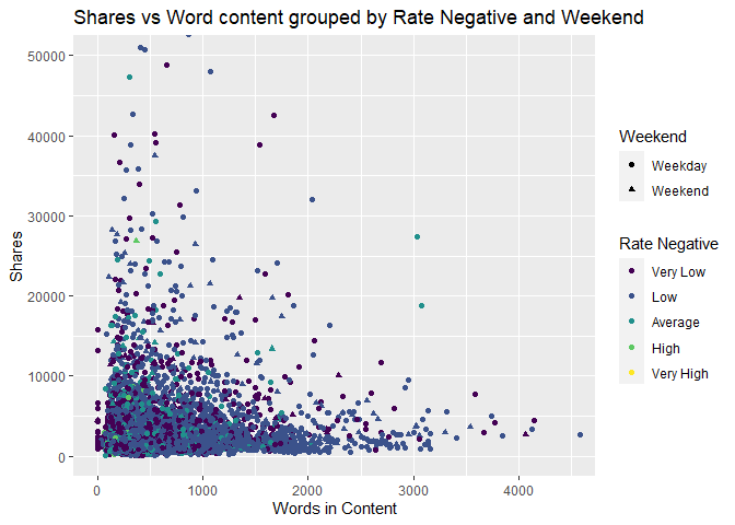 ggplot(newspop,aes(x=n_tokens_content,y=shares))+geom_point(aes(color=RateNeg,shape=weekend))+coord_cartesian(xlim=c(0,4500),ylim = c(0,50000))+labs(x="Words in Content", y="Shares",title="Shares vs Word content grouped by Rate Negative and Weekend", color="Rate Negative",shape="Weekend")